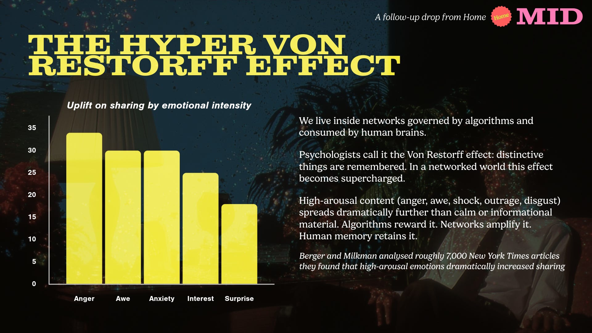 Material that provokes laughter, anger, fascination, surprise, terror, disgust, dread, fury or any other similarly visceral response will travel further than material that seems merely informative. All signals that spike sharply above the baseline are amplified.